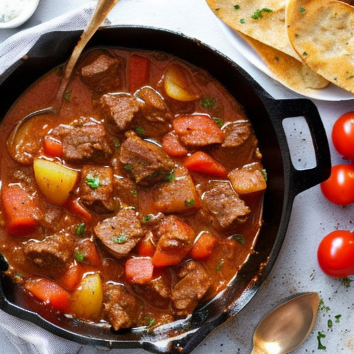 A hearty and delicious beef stew with potatoes and tomatoes.