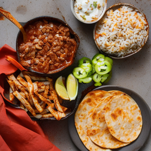 A delicious and filling meal of BBQ beef and chicken served on a bed of brown rice and wrapped in warm corn tortillas.