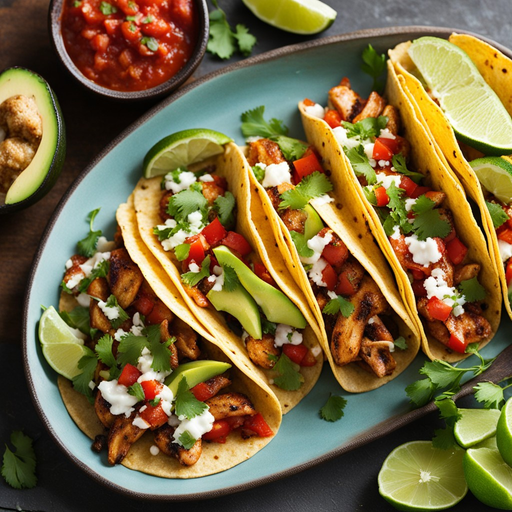 4. 4. Arma los tacos rellenando cada tortilla con el pollo picante, salsa, rodajas de aguacate, cilantro y un chorrito de jugo de limón.