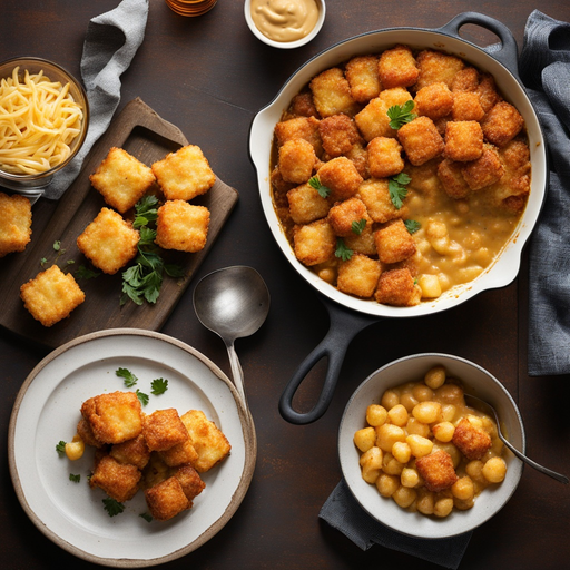 Un pastel reconfortante y abundante que incluye tater tots, papas fritas y galletas, cubierto con una mezcla de salsa cremosa.