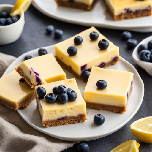 Deliciosas y cremosas barras de cheesecake con un estallido de sabores a arándanos y limón, cubiertas con una base de galletas Graham crujiente y mantecosa.