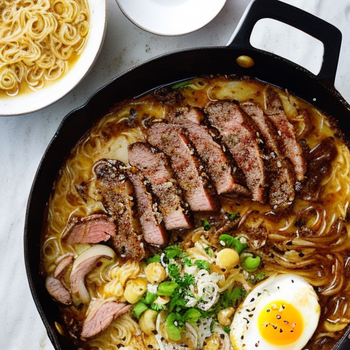 Una sabrosa sopa de fideos ramen con tierno rib-eye steak, perfecta para una deliciosa comida.