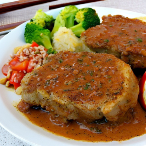 Un delicioso plato de jugosas chuletas de lomo de cerdo en una cremosa salsa de maní, servido con papas hervidas, tomates cortados en cubitos, brócoli, cebolla y ajo.