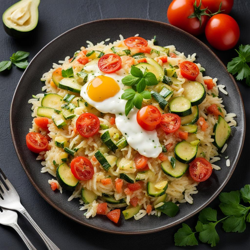 Un delicioso plato de desayuno hecho con calabacín, arroz basmati, tomates frescos y queso parmesano recién rallado.