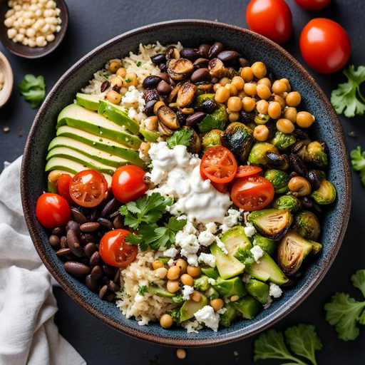 4. 4. En un tazón grande, combina frijoles negros, garbanzos, tomates frescos, queso feta, repollo, champiñones frescos y coles de Bruselas cocidas.