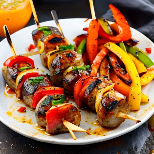 Un delicioso aperitivo hecho con salchichas bratwurst, cebolla picada y pimiento morrón naranja ensartados juntos.