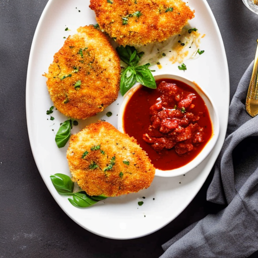 Pollo empanizado crujiente cubierto con salsa marinara y queso derretido