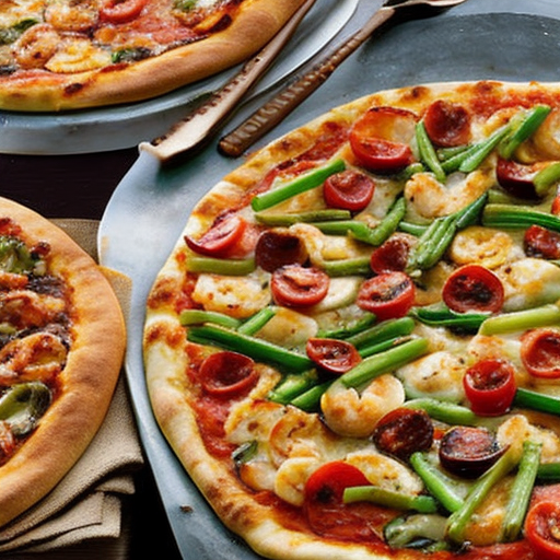Una deliciosa pizza cubierta con camarones salteados, tomates cherry, berenjena, judías verdes y queso cheddar.