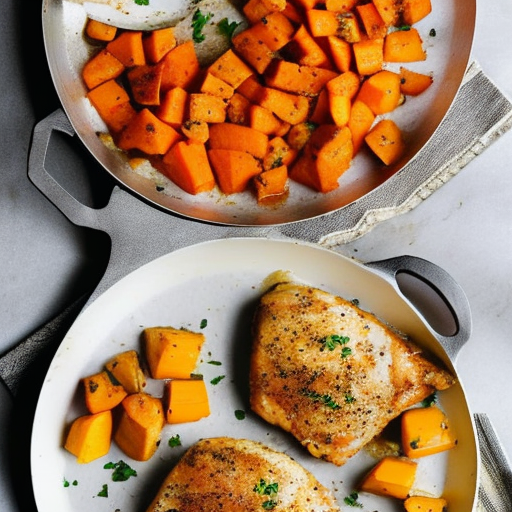 Un delicioso plato principal hecho con pechuga de pollo a la sartén y batatas.