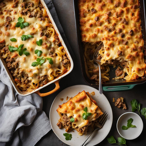 Un reconfortante y cremoso pastel de pasta con carne de res molida, champiñones y una capa de fettuccine con queso encima.