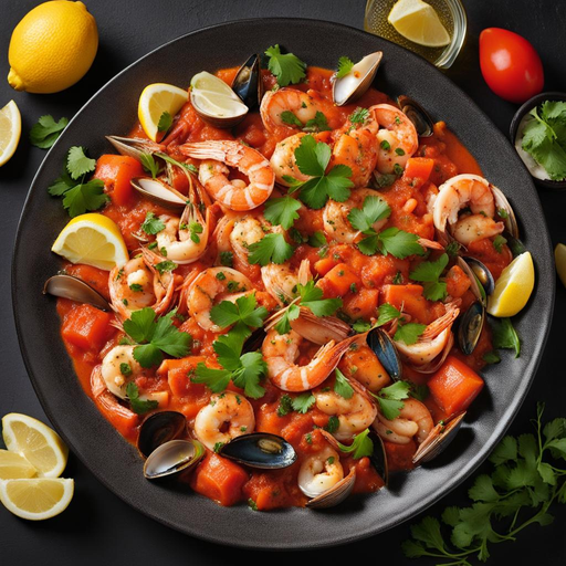 Un delicioso plato de mariscos con una mezcla de carne de cangrejo, atún, almejas, mejillones, filetes de tilapia, salmón, vieiras, camarones y jugo de limón fresco en una sabrosa salsa de tomate.