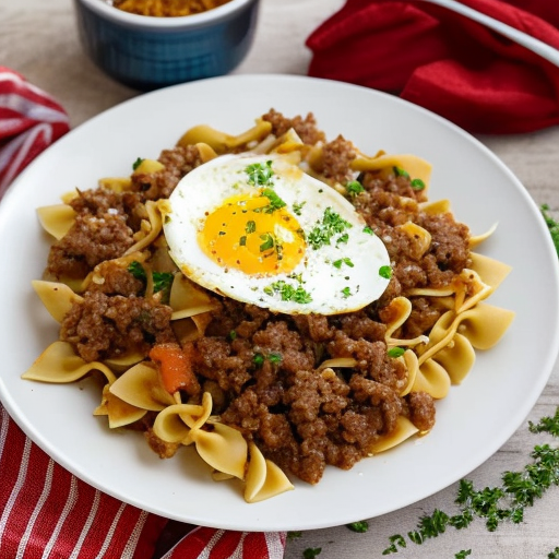 Un plato abundante y reconfortante con carne de res molida, cebolla blanca y fideos