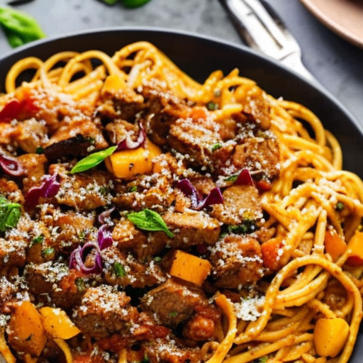 Un delicioso y sustancioso plato de espagueti hecho con calabaza y carne de res.
