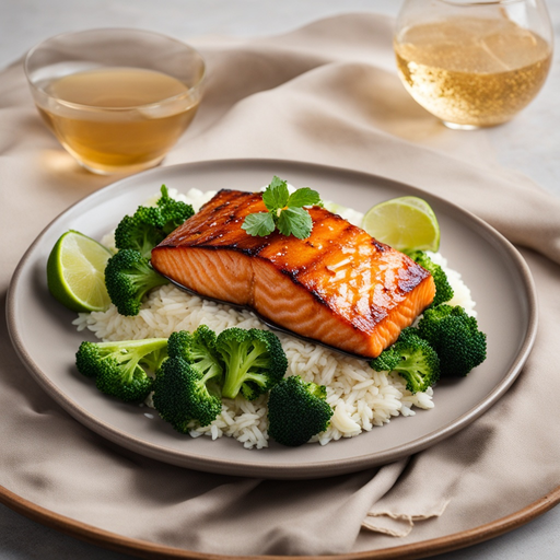 9. 9. Sirve el salmón glaseado con miel con brócoli al vapor y arroz jazmín.