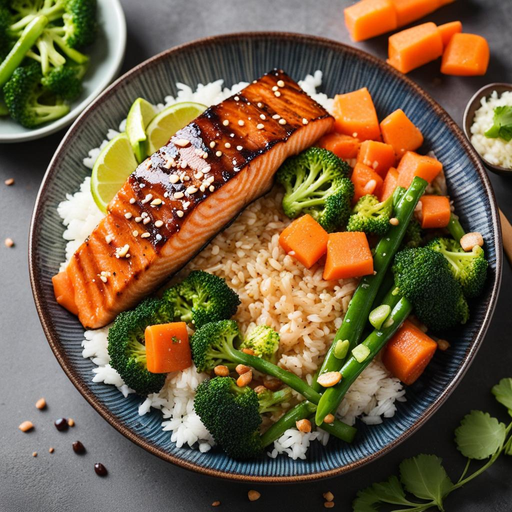 Un delicioso y saludable plato de inspiración japonesa que presenta un suculento salmón teriyaki servido sobre arroz con verduras al vapor.
