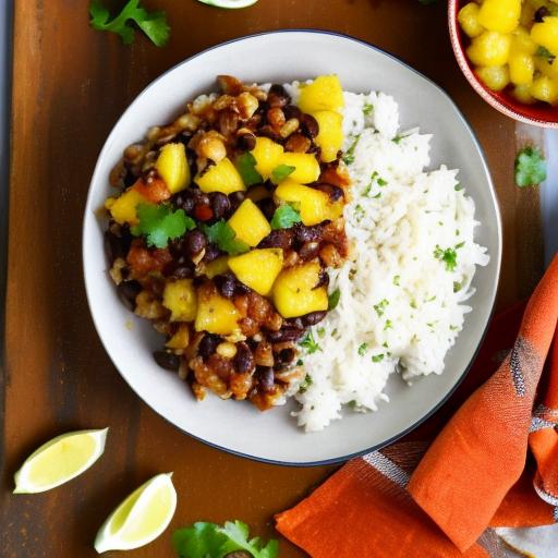 Un plato sabroso y abundante hecho con frijoles negros, maíz dulce, arroz basmati y trozos de piña.