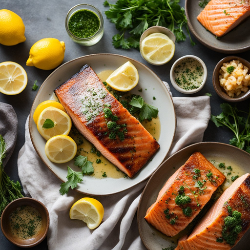 Un delicioso plato de inspiración francesa que presenta salmón sellado en una sabrosa salsa de mantequilla y hierbas.
