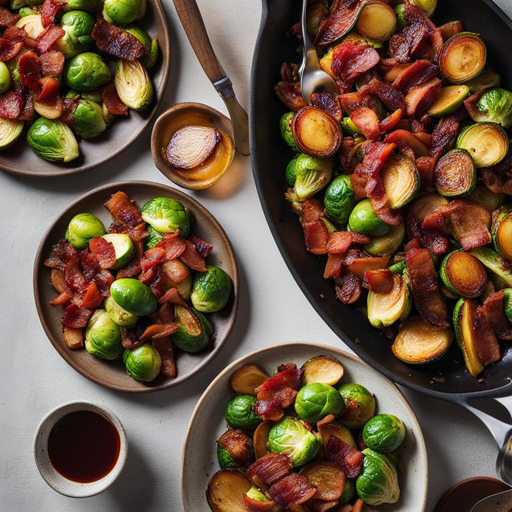 Un delicioso plato acompañante que presenta tocino crujiente, coles de Bruselas asadas y papas alargadas bañadas en un dulce glaseado de miel con un toque de picante de salsa picante.