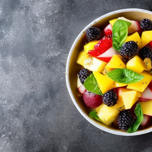 Una refrescante ensalada de frutas con un toque de albahaca fresca.