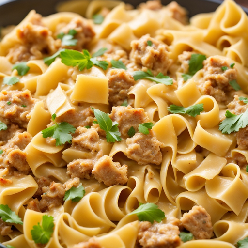 Un delicioso y cremoso plato de pasta hecho con pavo molido, pasta farfalle y una mezcla sabrosa de ajo y cebolla.
