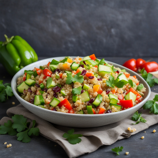 Una ensalada refrescante y nutritiva hecha con quinoa y una variedad de verduras frescas, sazonadas con comino y jugo de limón.