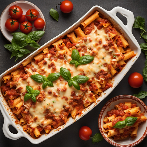 Un plato clásico italiano que presenta pasta ziti horneada con salsa de tomate, queso y hierbas.