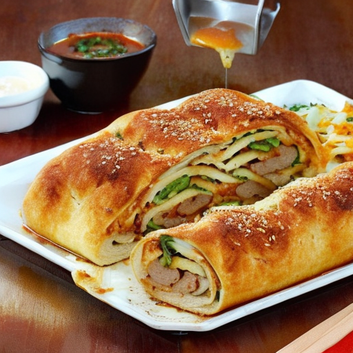 Un pan relleno sabroso con salchicha, cebolla, huevos, queso, verduras mixtas y ajo.
