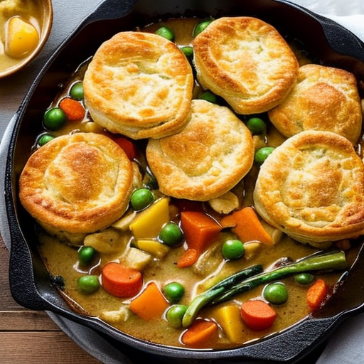 Un plato reconfortante y abundante con pollo tierno y verduras mixtas en un caldo sabroso, cubierto con masa de hojaldre escamosa