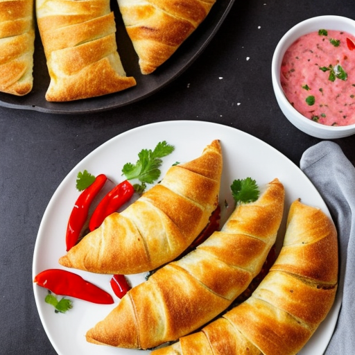 Un delicioso y abundante plato principal que presenta bratwurst, papas rojas y pimientos dulces envueltos en hojaldre.