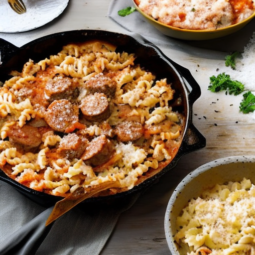 Una sabrosa sartén italiana con salsiccia, macarrones y arroz.