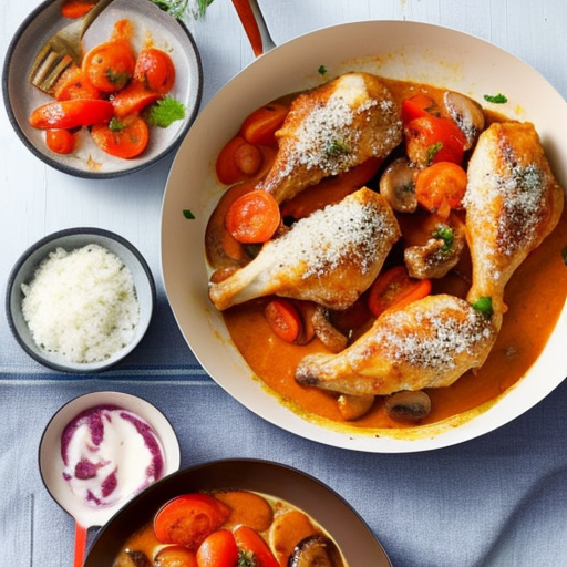 Muslos jugosos de pollo en una salsa cremosa de champiñones y tomate.