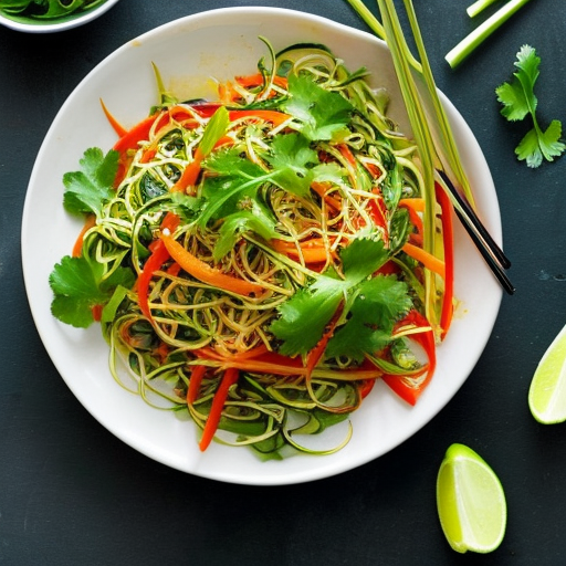 Un salteado delicioso y saludable hecho con fideos de calabacín, cebolletas, brotes de soja y perejil de hoja plana.