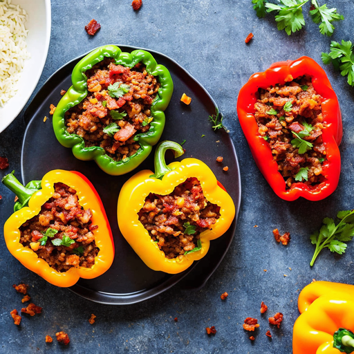 Deliciosos pimientos rellenos con una mezcla sabrosa de carne molida, tocino y arroz.