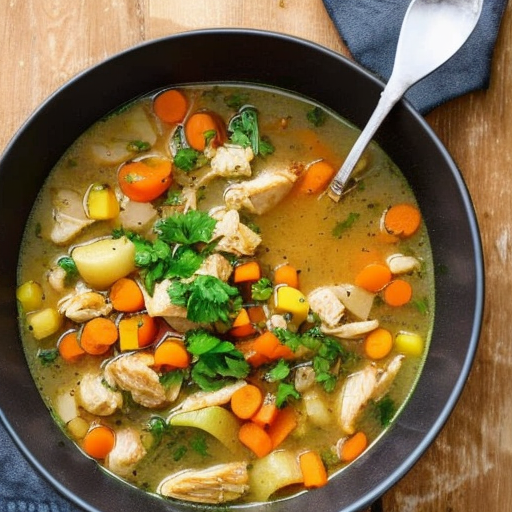 Una sopa abundante y sabrosa llena de pollo deshuesado, zanahorias pequeñas, perejil fresco, patatas hirviendo y especias.