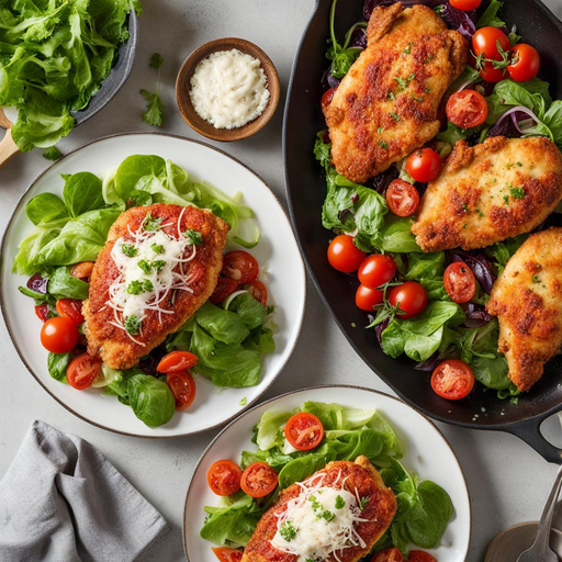 Un delicioso y crujiente pollo parmesano servido con una refrescante ensalada de tomate.