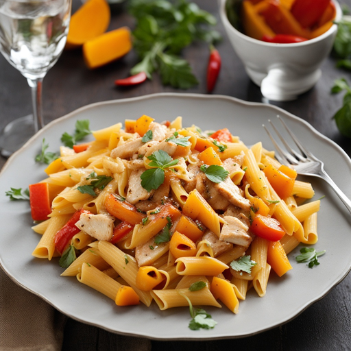 Un delicioso y abundante plato de pasta con tierno pollo, dulce calabaza y sabrosas especias