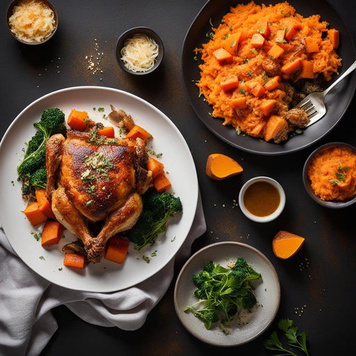 Deliciosos y sabrosos muslos de pollo recubiertos de queso parmesano, servidos con puré de batata y verduras asadas