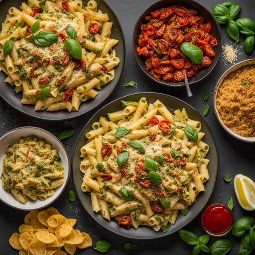 1. 1. Cocina la pasta según las instrucciones del paquete. 2. En una sartén grande, cocina la pechuga de pollo deshuesada hasta que esté completamente cocida. Retira y reserva. 3. En la misma sartén, añade caldo de pollo, tomates secos, salsa, y mostaza. Mezcla bien. 4. Agrega salsa alfredo y pesto a la sartén. Mezcla hasta que esté combinado. 5. Corta la pechuga de pollo cocida y agrégala nuevamente a la sartén. 6. Escurre la pasta cocida y agrégala a la sartén. Mezcla todo hasta que esté bien cubierto. 7. Sirve caliente con un toque de migas de pan por encima.