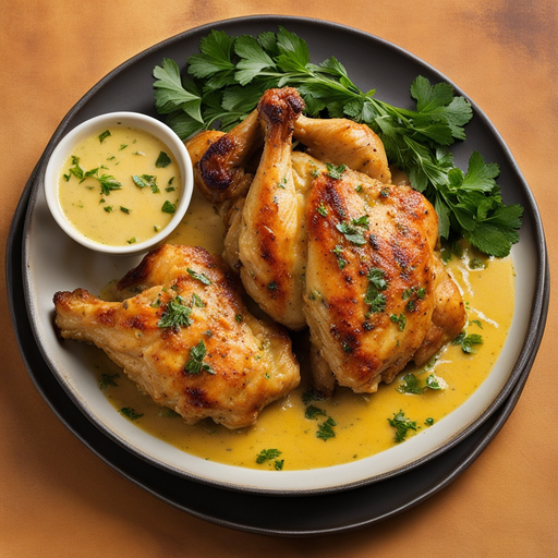 Jugoso pollo frito bañado en una sabrosa salsa de mantequilla y ajo
