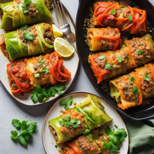 Deliciosos y saludables rollos de col rellenos con una mezcla de verduras y especias, perfectos para una comida vegetariana.
