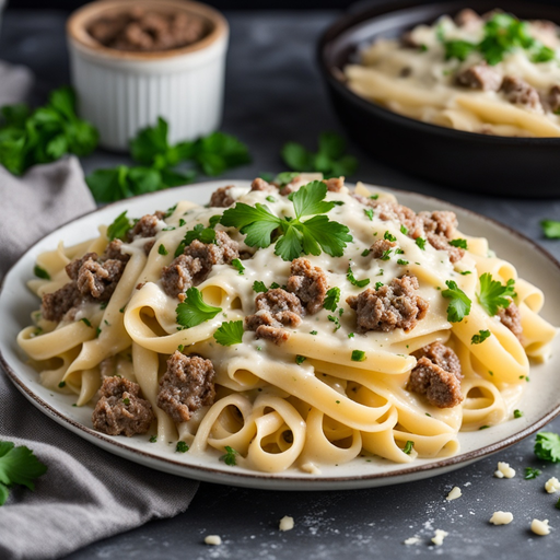 Un delicioso y cremoso plato de pasta con sabroso carne molida y salsa alfredo rica