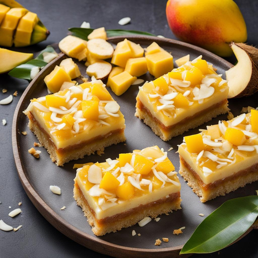 5. Cubre con rodajas de mango, plátano y coco rallado. Enfría en la nevera durante al menos 1 hora antes de cortar en barras.