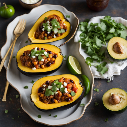 Un delicioso y nutritivo plato inspirado en la cocina mexicana que presenta una mezcla de frijoles, arroz y salsa de enchiladas rellenos en calabaza asada.