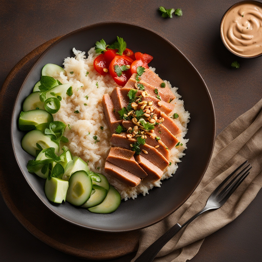 Una fusión de sabores con atún picante y crema de maní cremosa servida sobre arroz blanco y puré de papas