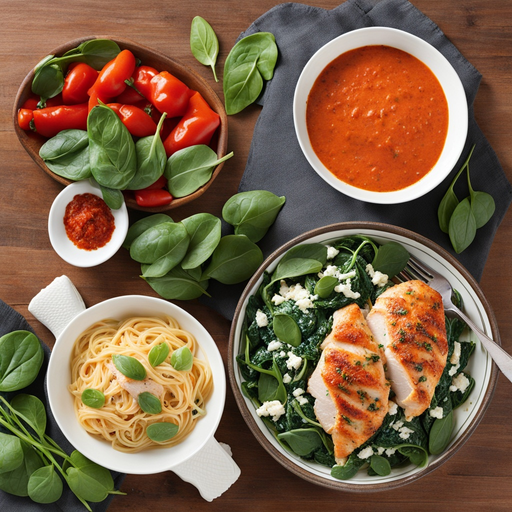 Des blancs de poulet juteux farcis d'une garniture crémeuse aux épinards et au féta, servis avec des pâtes angel hair et une sauce aux poivrons rouges rôtis.