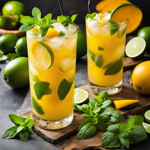 Feuilles de menthe, tranches de mangue et quartier de citron vert pour la garniture