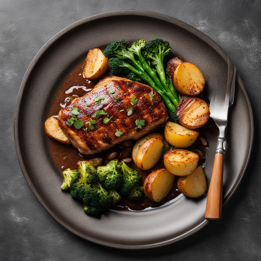Un plat savoureux et plein de saveurs mettant en vedette des blancs de poulet tendres nappés de sauce steak, servis avec des pommes de terre à l'ail et des fleurons de brocoli rôtis.