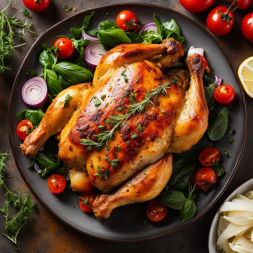 3. 3. Dans un plat de cuisson, disposez les poitrines de poulet et garnissez-les d'oignons tranchés, d'ail et de tomates cerises.