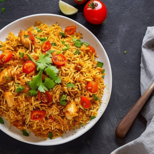 Un plat de riz indien savoureux et aromatique avec du poulet désossé tendre, du riz basmati, des oignons et des tomates en dés.