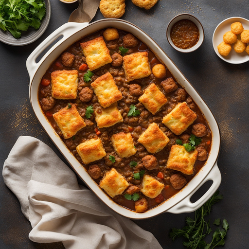 Un plat copieux et réconfortant mettant en vedette du bœuf haché, des croquettes de pommes de terre et des biscuits feuilletés.